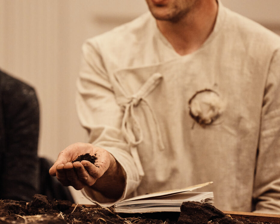 Part interactive lecture, part performance, Distillation features original text, video, sound design, and sculpture. You will be seated around a large custom-made table and are gently invited to hold organic materials and smell parts of the landscape as part of the experience. The perfume featured as part of the project was designed by Joan Woods, who collected and distilled botanicals from the Irish Midlands as part of the creative process. Each audience member is gifted a small sample of the custom-made perfume as part of the performance.